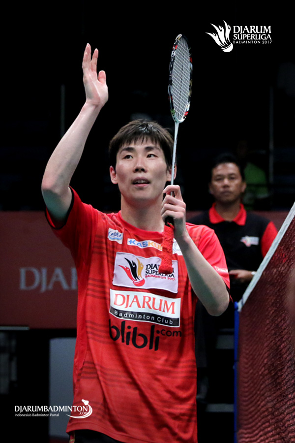 Son Wan Ho (PB Djarum) memberikan apresiasi kepada para pengunjung Djarum Superliga Badminton 2017.