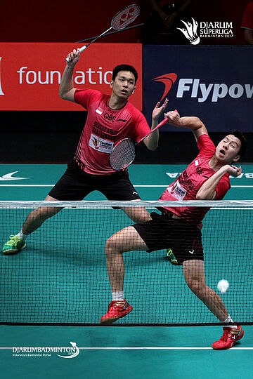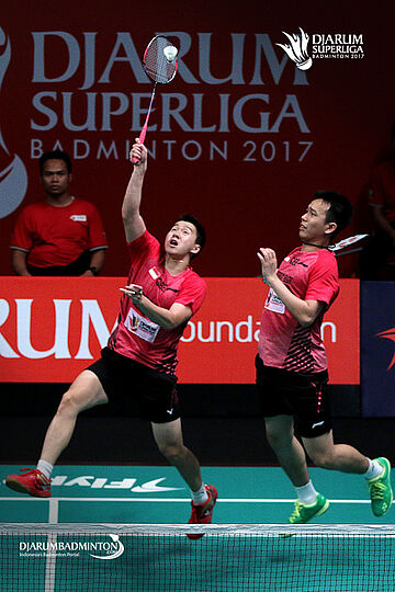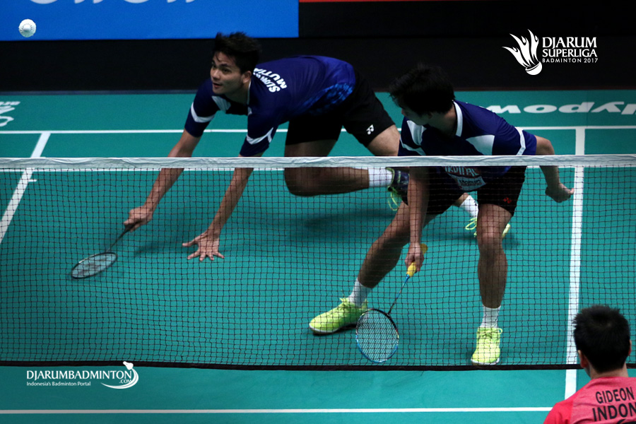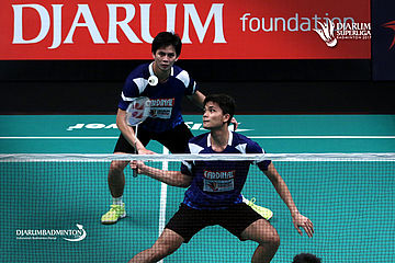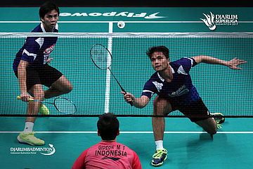 Andrei Adistia/Ricky Karanda (PB Mutiara Cardinal) menyambut pengembalian.