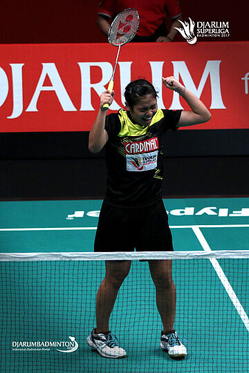 Selebrasi kemenangan Gregoria Mariska (PB Mutiara Cardinal).