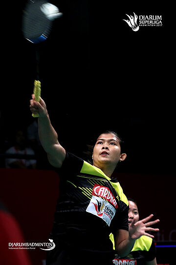 Tiara Rosalia/Yulfira Barkah (PB Mutiara Cardinal) melepaskan serangan.