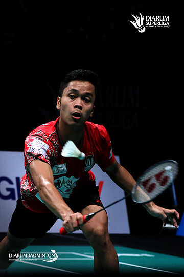 Anthony Sinisuka Ginting (PB Musica Champion) menghadang serangan.