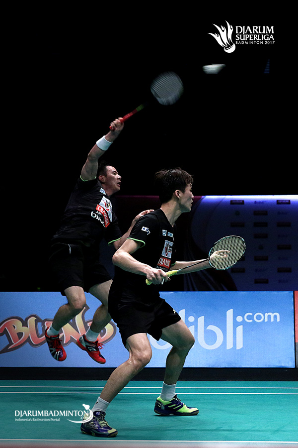 Ko Sung Hyun/Shin Baek Cheol (PB Djarum) melepaskan serangan.