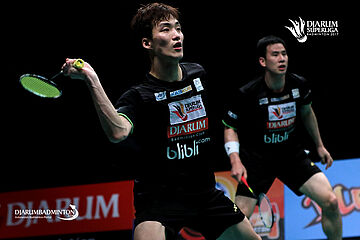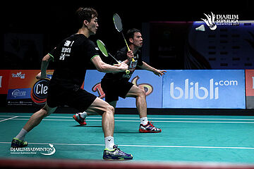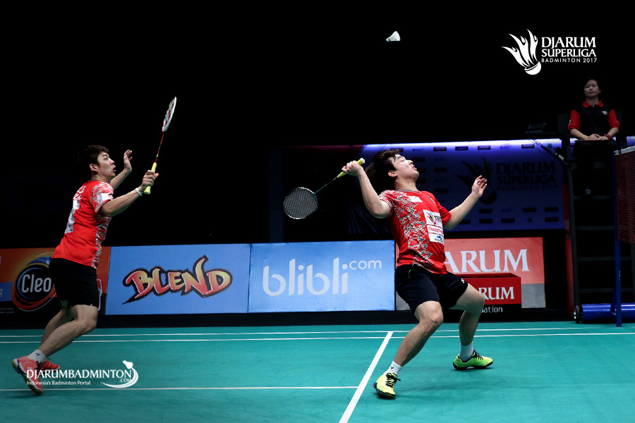 Ko Sung Hyun/Shin Baek Cheol (PB Djarum) bersiap menghadang serangan.