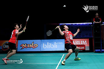 Ko Sung Hyun/Shin Baek Cheol (PB Djarum) menghadang serangan.