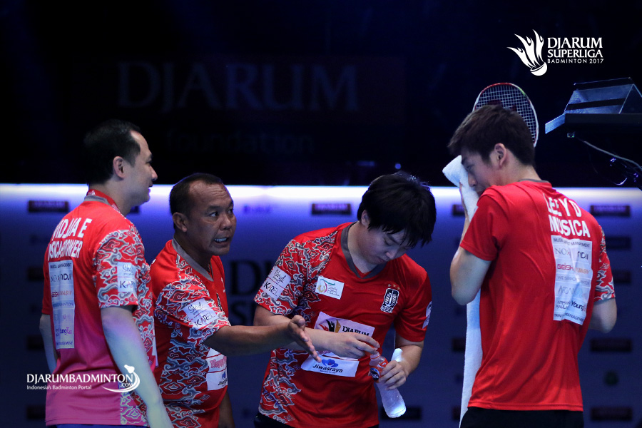 Ko Sung Hyun (PB Djarum) mendapat pengarahan dari pelatih.