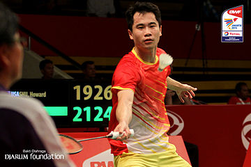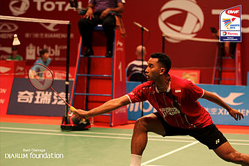 Tommy Sugiarto (INA) berusaha menggapai shuttlecock
