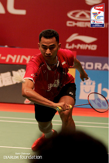 Tommy Sugiarto (INA) mengembalikan shuttlecock ke arah lawan
