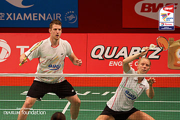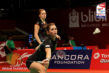 Heather Olver/Lauren Smith (ENG) berusaha mengembalikan shuttlecock ke arah lawan