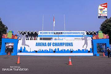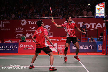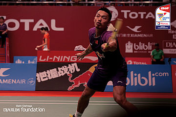 Lin Dan (CHN) berusaha menggapai shuttlecock