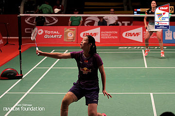 Petya Nedelcheva (BUL) mengembalikan shuttlecock ke arah lawan