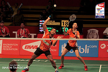 Edi Subaktiar/Gloria Emanuelle W (INA) menyambar pengembalian lawan