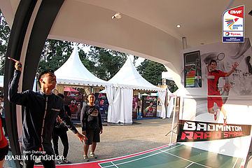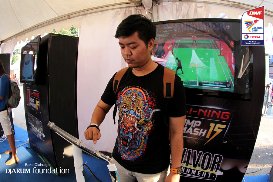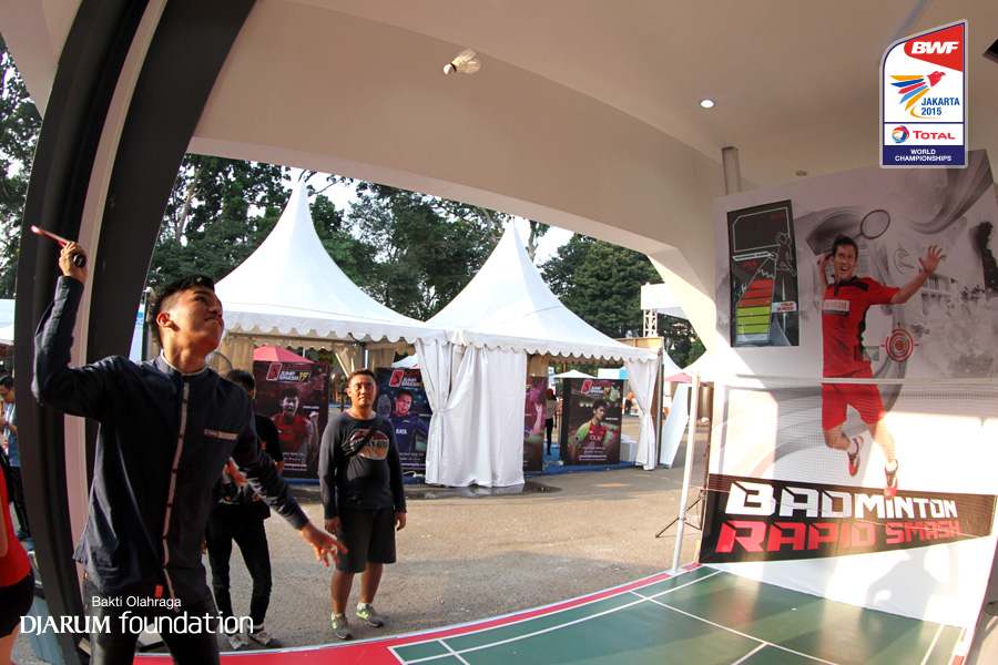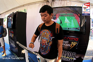Salah satu pengunjung saat menjajal game badminton rapid smash di booth Djarum Foundation