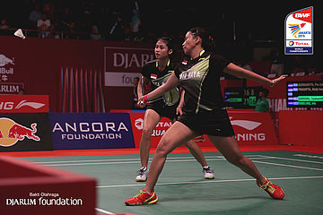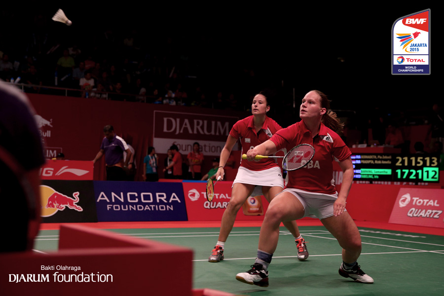 Samantha Barning/Iris Tabeling (NED) bersiap menyambut pengembalian dari Pia Zebadiah/Rizki Amelia (INA)