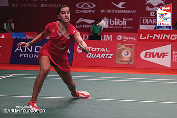 Carolina Marin (ESP) menyambut pengembalian dari Tee Jing Yi (MAY)