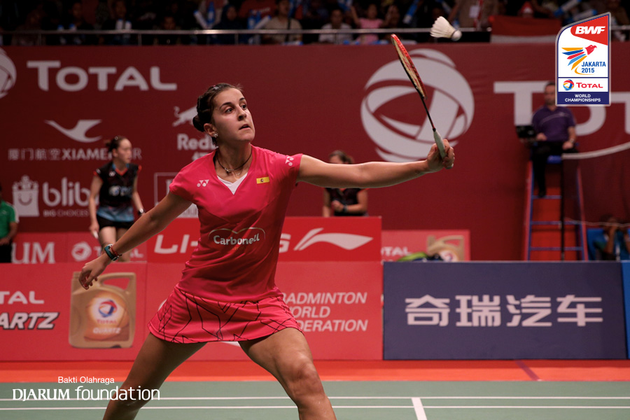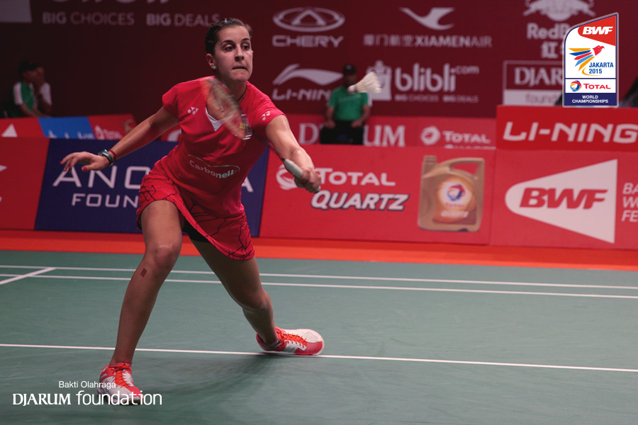 Carolina Marin (ESP) mengembalikan shuttlecock ke arah Tee Jing Yi (MAY)