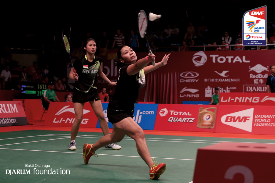 Pia Zebadiah/Rizki Amelia (INA) mengembalikan shuttlecock ke arah Samantha Barning/Iris Tabeling (NED)