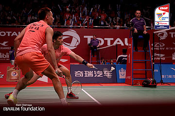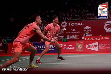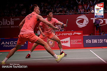 Fu Haifeng/Zhang Nan (CHN) menahan serangan lawan