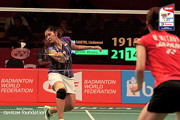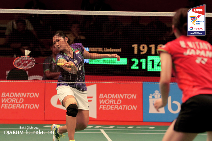 Lindaweni Fanetri (INA) mengembalikan shuttlecock ke arah lawan
