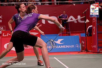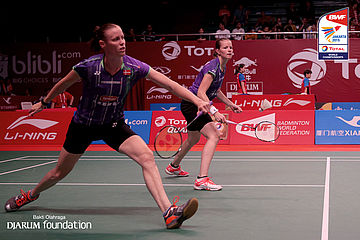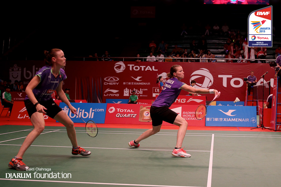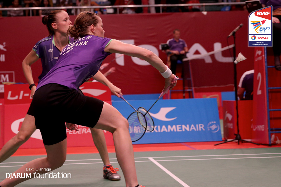 Christinna Pedersen/Kamila Rytter Juhl (DEN) mengembalikan shuttlecock ke arah lawan