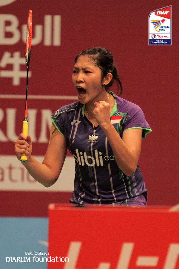 Ekspresi Lindaweni Fanetri (INA) saat memenangkan pertandingan