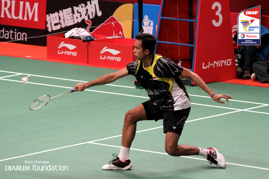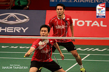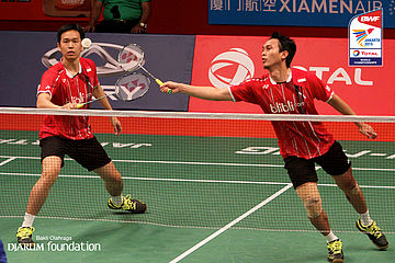 Mohammad Ahsan/Hendra Setiawan (INA) berusaha menggapai shuttlecock