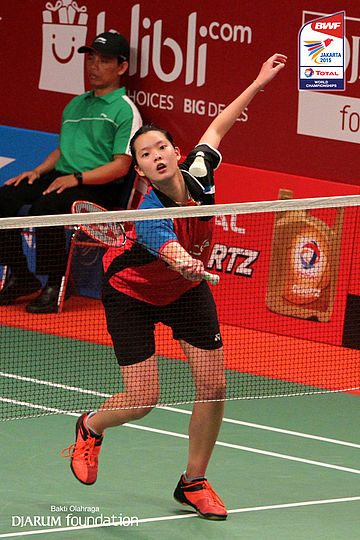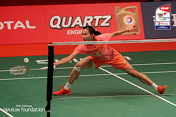 Wang Yihan (CHN) menyambar pengembalian lawan