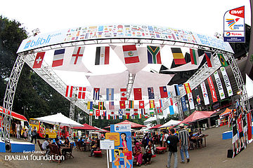 Macam-macam bendera peserta Total World Championships 2015 menghiasi dekorasi foodcourt