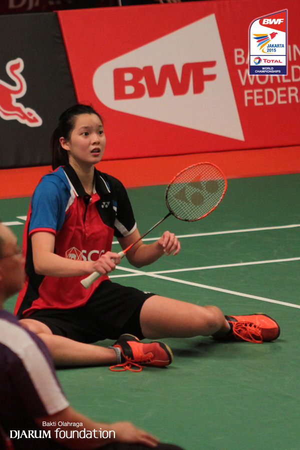 Puttita Supajirakul (THA) terjatuh saat mencoba menggapai shuttlecock