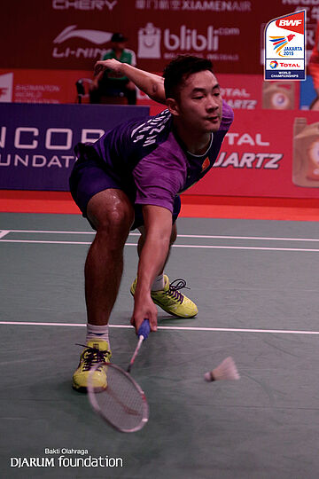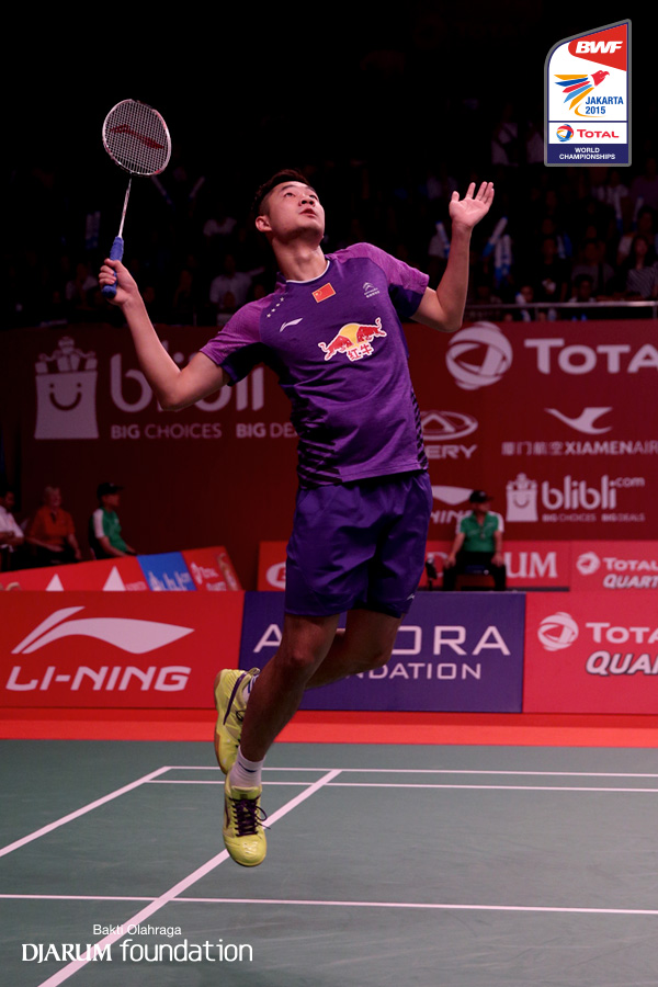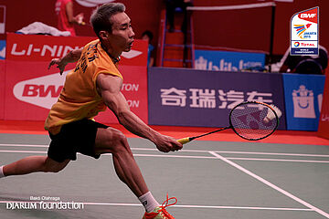 Lee Chong Wei (MAS) mengembalikan shuttlecock ke arah lawan