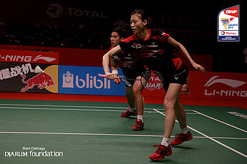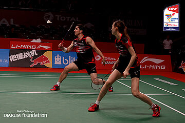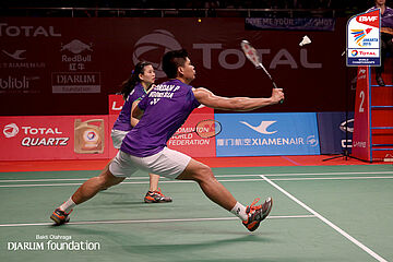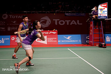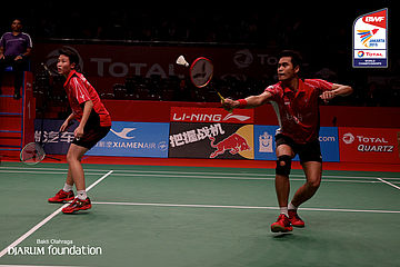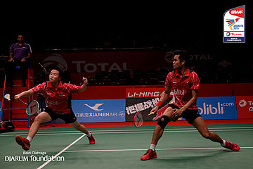 Tontowi Ahmad/Liliyana Natsir (INA) berusaha menggapai shuttlecock