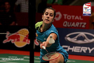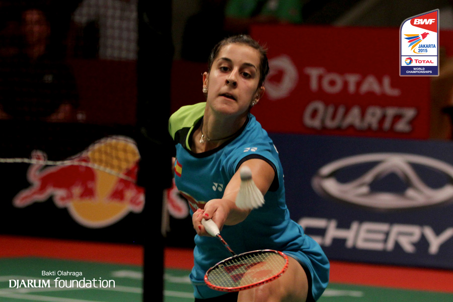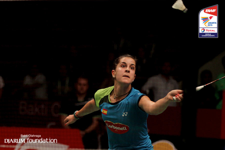 Carolina Marin (ESP) mengembalikan shuttlecock ke arah lawan