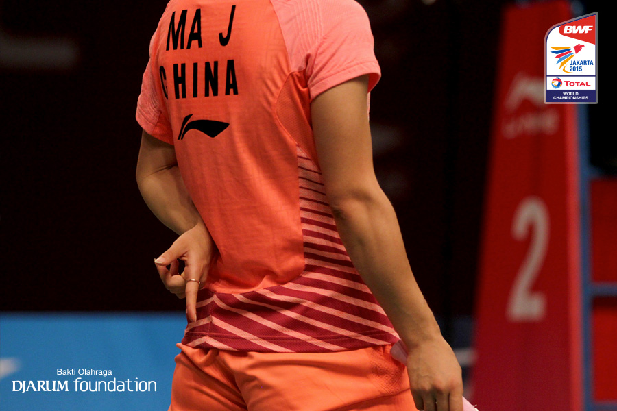 Ma Jin (CHN) memberikan kode kepada patnernya