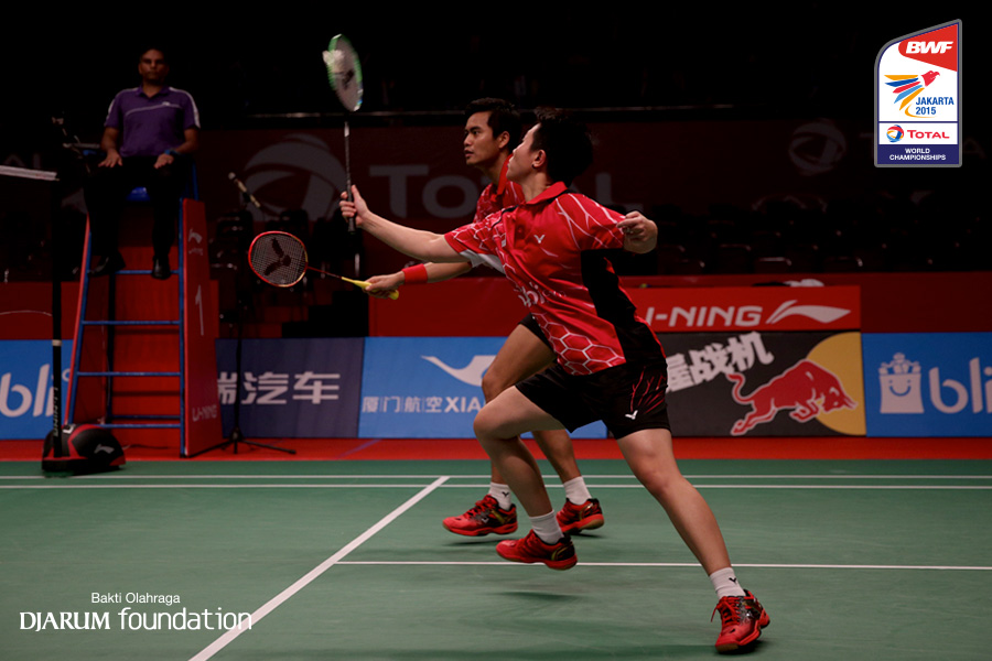 Praveen Jordan/Debby Susanto (INA) menahan serangan lawan