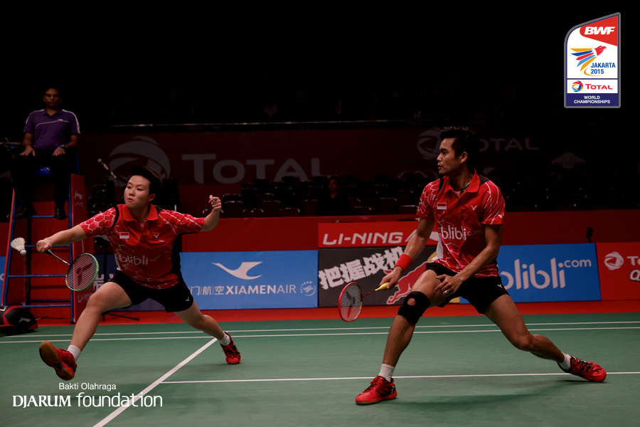 Tontowi Ahmad/Liliyana Natsir (INA) menahan serangan lawan