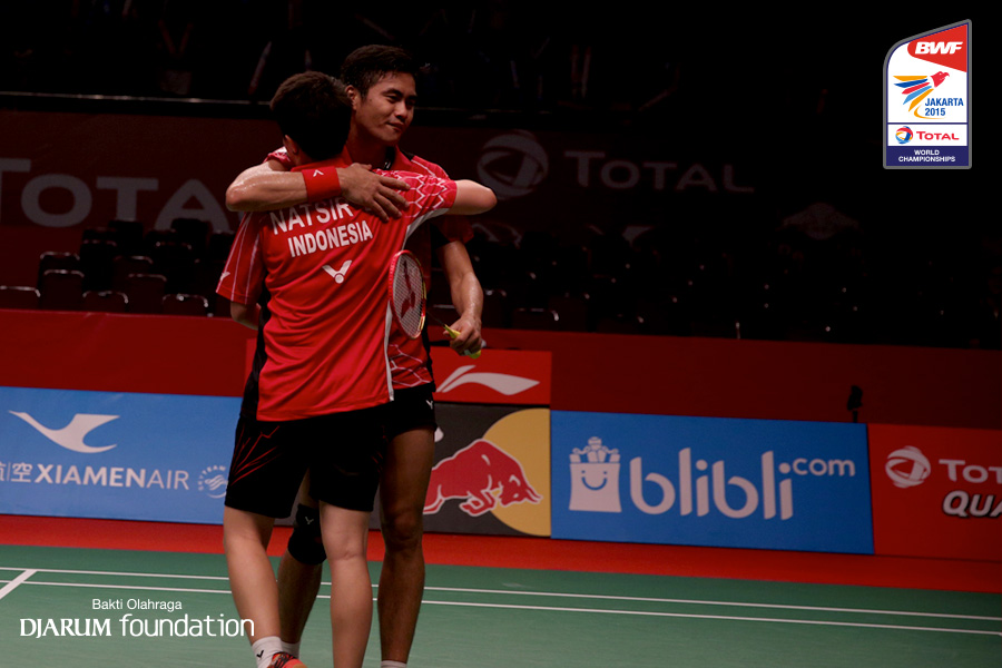 Tontowi Ahmad/Liliyana Natsir (INA) berpelukan seusai memenangkan pertandingan