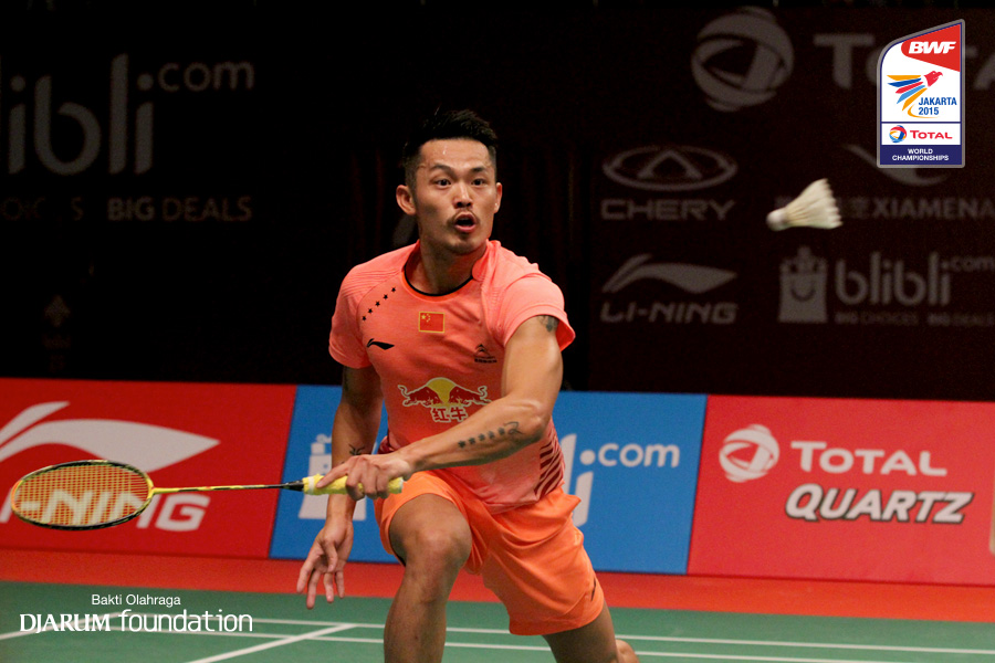 Lin Dan (CHN) menahan serangan lawan