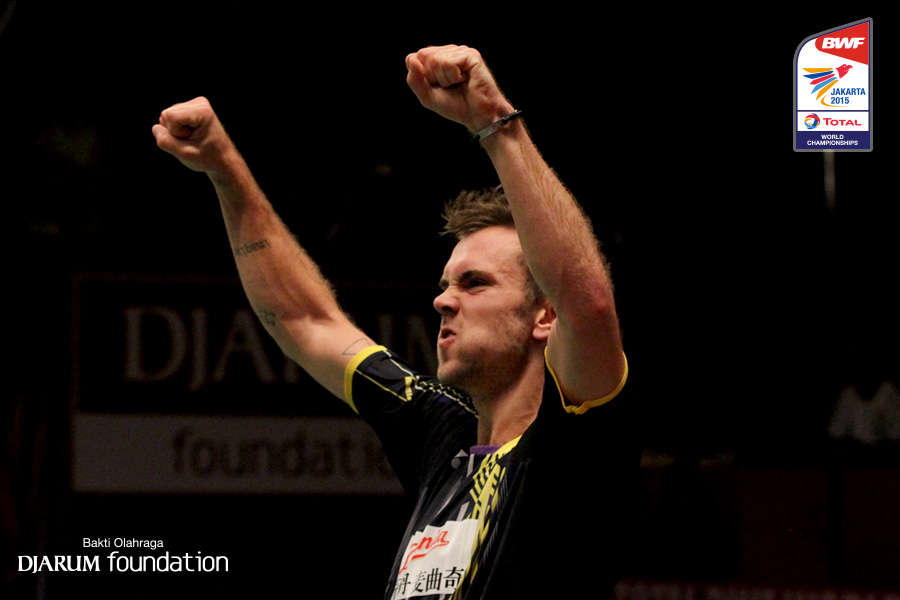 Ekspresi Jan O Jorgensen (DEN) saat memenangkan pertandingan